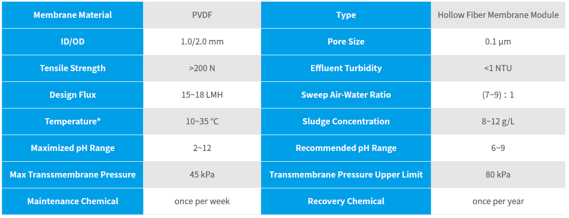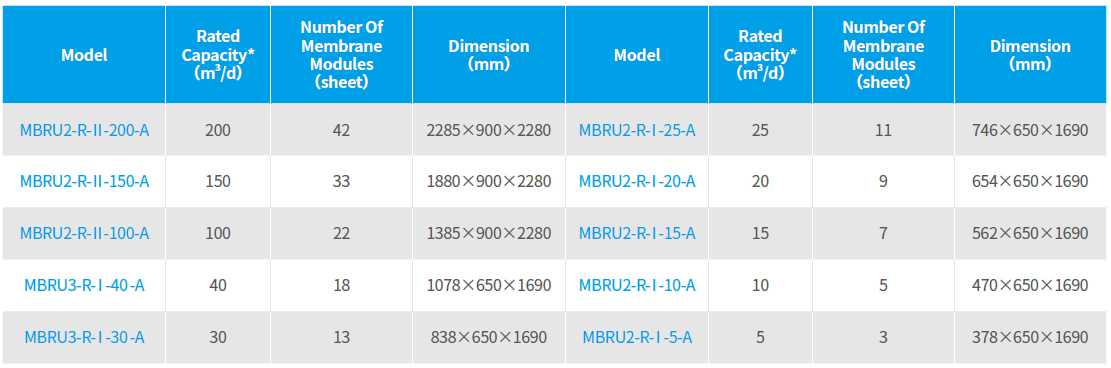 Notes: (1) *Treatment capacity with water temperature of 20℃ and sludge concentration of 8~12g/L;