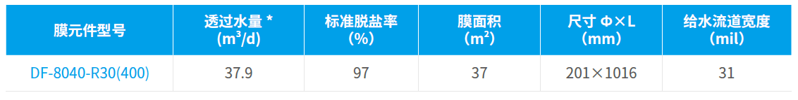 注:(1)* 透过水量根据实际情况有±15 % 波动; (2)测试条件:2000 ppm MgSO₄,70 psi(0.48 MPa),25 ℃,pH=7.5~8.0,回收率15 %。