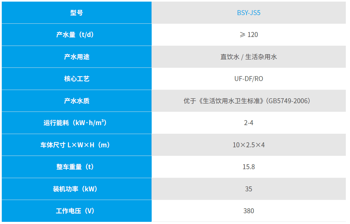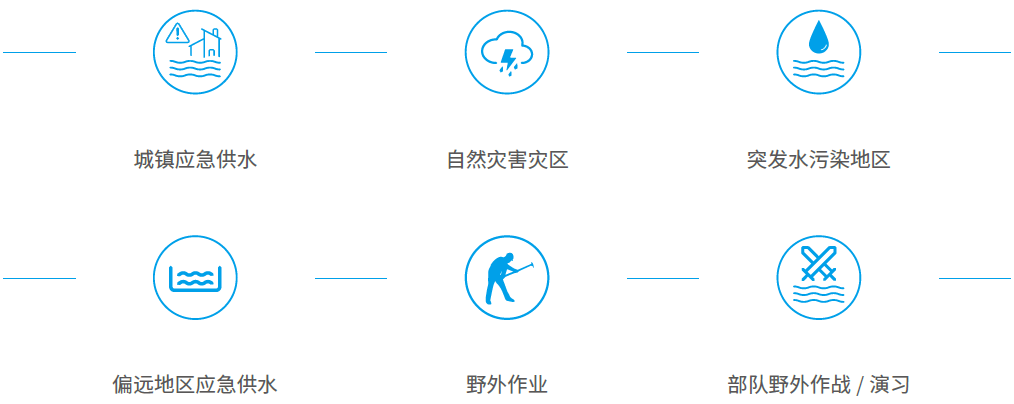 应急净水车(Emergency Water Purifying Vehicle)是应对台风、地震、洪涝、泥石流等自然灾害和突发性水源污染事故时的移动式应急净水设备,是采用公司自主研发以UF-DF/RO 双膜法为核心的饮用水制备技术与车辆有机结合的装置。具有强大的原水适用性、响应迅速、性能可靠、依靠自身动力供水等特点,满足各类应急供水需求。在我国住房和城乡建设部的“国家供水应急救援能力建设”项目获得验收通过。